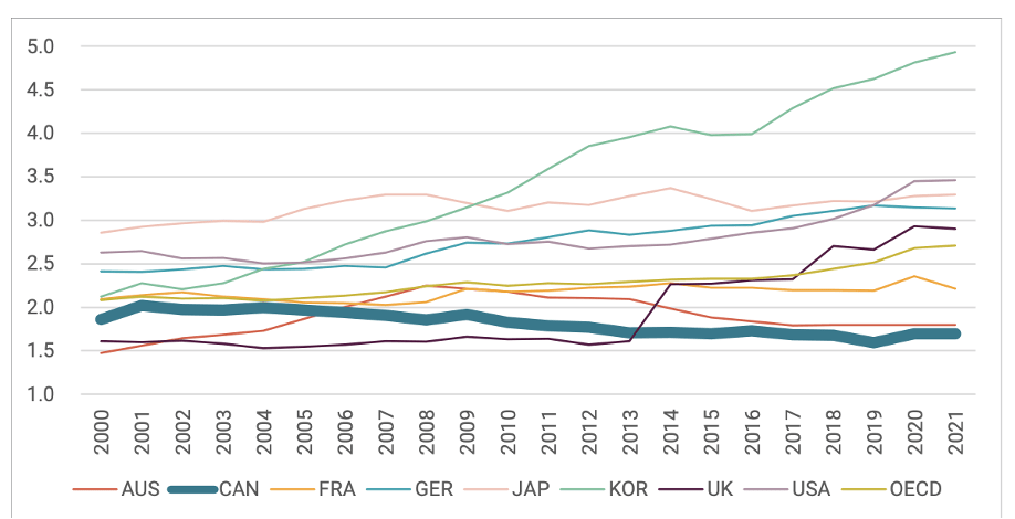 (Figure B-1, 2000-2021 Trend of R&D Spending as a Percentage of GDP, Selected OECD countries, as cited in Usher & Balfour, 2023, p. 68)